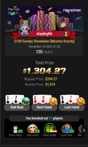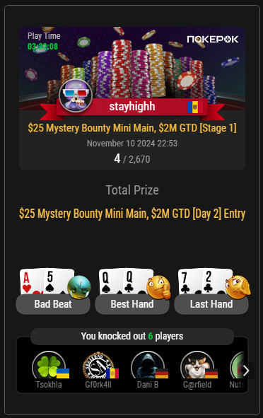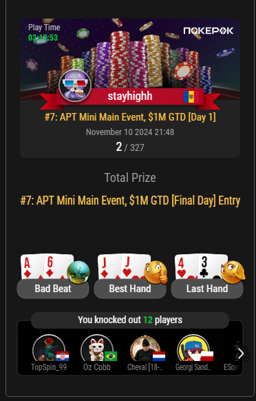 В основном был упор на мистери на 108,чтобы пронести хороший стек играл все 3 фазы,но отобрался только с самой первой пули и имею 18бб на второй день,но сыграю еще в след воскресенье несколько думаю.Самый дорогой был мэин по 525,там кстати почти сразу поехал с АКс против 52с и удалось обыграть.Но потом карддэд,2 раза флипал за ноки,но оба проиграл и в итоге вылетел.Отобрался на ГГ мастерс по 150 через сателлит(он был кстати какой-то очень потный,в конце все сидели выживали со средним стеком 2.5бб,былло забавно).Но, в самом турнире структура как будто так себе,плюс сатик затянулся видимо и залетел туда я уже на 40бб где-то.Достаточно быстро вылетел с него,к сожалению.