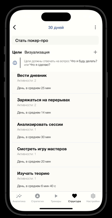 Составив список желаний, стремлений и привычек и разбив их на цели и задачи, вы получаете набор активностей (задач), с которыми можно работать в других разделах. Активности можно создавать и вне желаний, налету.