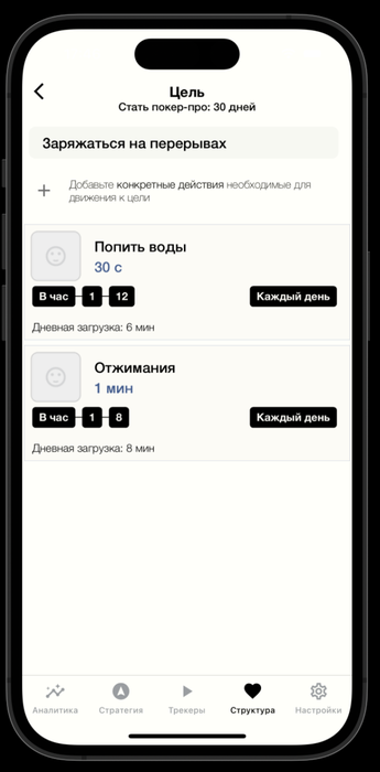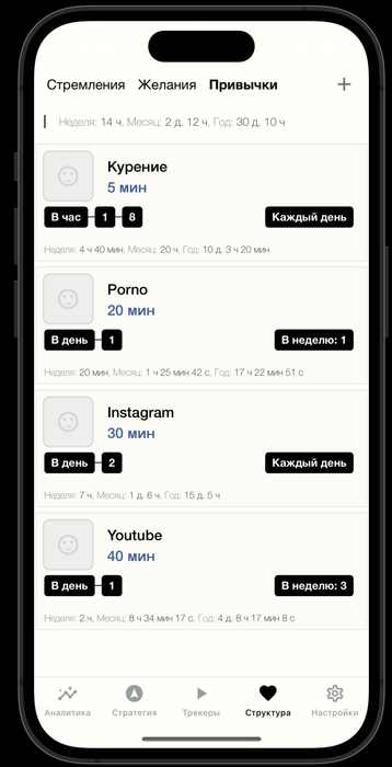 - Интеграция с приложением экранного времени для учета его в общей аналитике