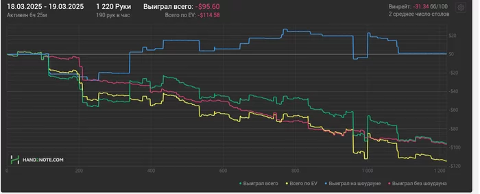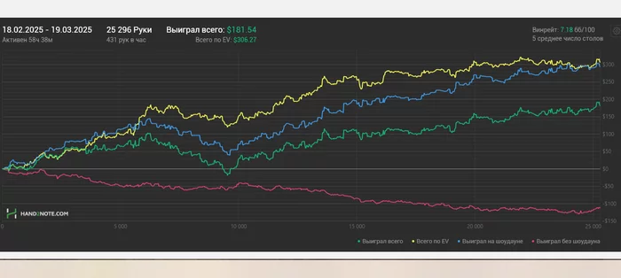 Получаем около 270$ по деньгам и около 400$ по EV за 25к рук.