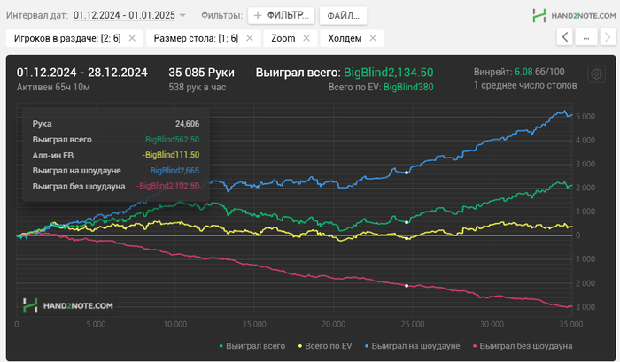 Сравниваю декабрь и ноябрь и понимаю, что у меня в игре ничего не изменилось. Минуса нет, что для игры пенсионера уже хорошо, особенно на поле быстрого покер. Да, в этом месяце госпожа Дисперсия была на моей стороне, пожалуй единственное отличие от ноября. Результат по позициям, общая форма графика. Понимаю что настало время более детального анализа, а именно всякие конбеты, чекрейзы и т.п. Отойду от праздников и обдумаю это. Банкрола хватает для NL5 но по игре не чувствую себя готовым.