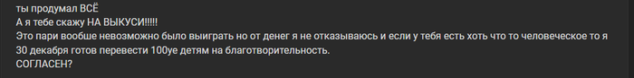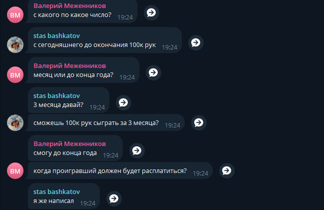 Если посмотришь по переписке, изначально я постучался к нему с вопросом проиграл ли он наше пари, и почему он ничего не обсудил со мной и не скидывает отчет. И что в таком случае он либо отдает то что должен, либо играет по нашим условиям. На что я сразу получаю ответ что я больной человек. У которого нет спортивного интереса, а значит наше пари недействительное.