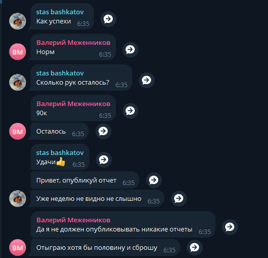 В период этих 10 дней, я ему пишу дабы спросить как у него вообще дела и как дела с покером, на что получаю ответ что он перестает делится со мной отчетами, сказал как откатает половину наших обговоренных рук тогда скинет.