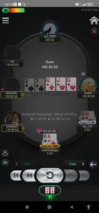 Была ещё раздача прикольная в мини Хайроллер по 1000р. Самая первая раздача у меня на бб все фолд мб опен рейз я 3 бет он 4 бет я мин 5 бет он 6 бет я 7 бет крупнее он 8 бет пуш 200 бобов я кол и вижу там?))мощь