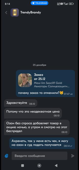 Вообщем он еще позавчера заметил что очки которые днём стоят 23к, ночью цена опускается до 11500 и вот он их заказал, а утром заказ был отменен, вот что ответил продавец