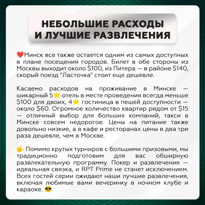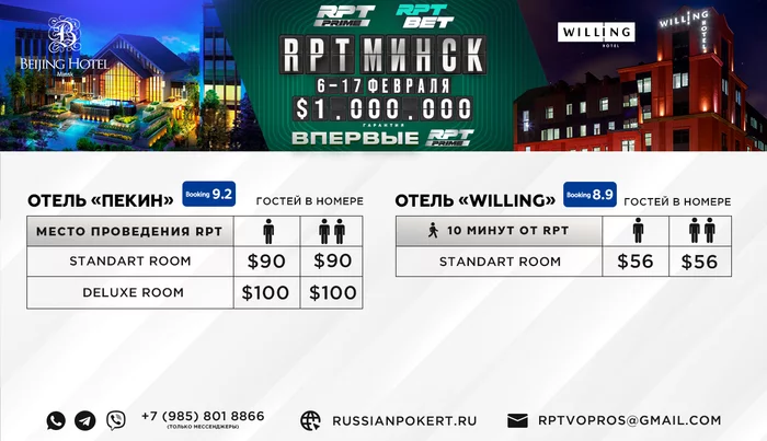 🏆 Разбираем, друзья! Подъехали пакетные предложения к RPT Prime 6-17 февраля в Минске! ⠀ К будущему этапу RPT Prime приковано огромное внимание со стороны игроков. «Пакет участника» — это отличная возможность принять участие в турнирах серии и получить значительную скидку на проживание в отеле. А свободные номера разлетаются с каждым днем! ⠀ ☝🏻 В рамках будущей серии 6-17 февраля мы предлагаем гостям ТРИ пакетных предложения: ⠀ ПАКЕТ № 1️⃣ — $4,245 (Стандартный)