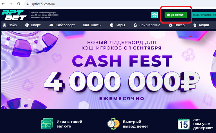 1️⃣ Входим в свой аккаунт на сайте rptbet77.com, после чего жмем на кнопку "Депозит".