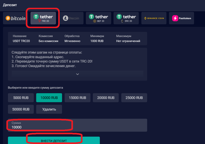 2️⃣ Затем в открывшемся окне выбираем все как на скрине ниже — "Крипто", "Tether TRC 20", вводим желаемую сумму депозита (минимум 1000 росс. рублей) и жмем на кнопку "Внести депозит".