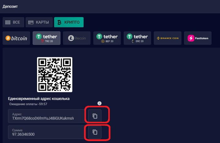 3️⃣ В появившемся окне нам нужно будет скопировать адрес кипто-кошелька и сумму, сделать это можно, нажатием на выделенные кнопки. Но пока оставляем это окно открытым и переходим к следующему пункту.