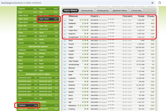 К примеру, у нас карта Сбербанка, покупать мы будем "Tether ERC 20", а значит прожимаем все как на скриншоте ниже и наблюдаем в правой части экрана сайты, готовые к совершению обмена. Обменники будут отсортированы от более выгодному курсу к менее выгодному. Одним из критериев выбора является минимально возможная сумма для обмена, ее можно увидеть в поле "Отдаете".
