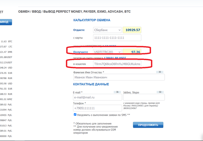 Вводим свой номер карты, с которой будете совершать обмен, далее заполняем ФИО, е-мейл и пишем номер телефона.