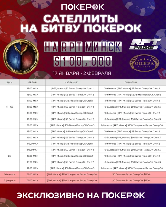 🏆 Уже завтра в руме ПокерОК стартуют онлайн-сателлиты к турниру Битва ПокерОК, который будет проходить 12-13 февраля в рамках RPT Prime в Минске с бай-ином $1100 и гарантированным призовым фондом $100,000. ⠀ 💰 Отбор пройдет в формате степ-сателлитов с 17 января по 2 февраля, ПокерОК гарантированно разыграет в это событие минимум 50 билетов. Бай-ины в степах — всего от $1! ⠀ Ежедневно (с понедельника по субботу - в 21:00, в воскресенье - в 17:00) будет проходить степ-сателлит с бай-ином $50 и гарантией 8 билетов по $250 в финальный Ультра сателлит. ⠀ Финальных ультра сателлитов будет два: 🟢 26 января в 21:00 по МСК — бай-ин $250, гарантия — 30 билетов по $1,100 в турнир Битва ПокерОК на RPT Prime; 🟢 2 февраля в 21:00 по МСК — бай-ин $250, гарантия — 20 билетов по $1,100 в турнир Битва ПокерОК на RPT Prime; ⠀ 🎁 ВКОНТАКТЕ и в Инстаграм мы запустили розыгрыши, в которых разыгрываем билеты в степ-сателлиты с бай-ином $50. Переходите по ссылкам и принимайте участие! 🎁