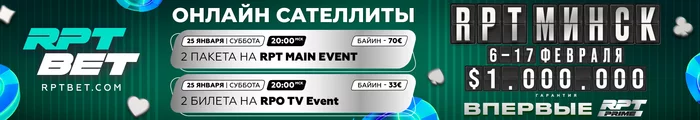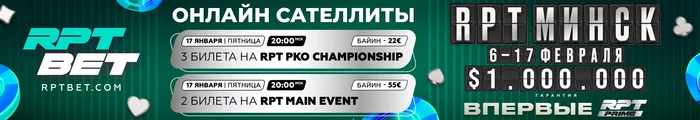 🏆 Сегодня на RPTBET два отличных онлайн-сателлита к RPT Prime 6-17 февраля в Минске — разыграем минимум ТРИ БИЛЕТА в Belarus PKO Championship, а также минимум ДВА БИЛЕТА в RPT Main Event.