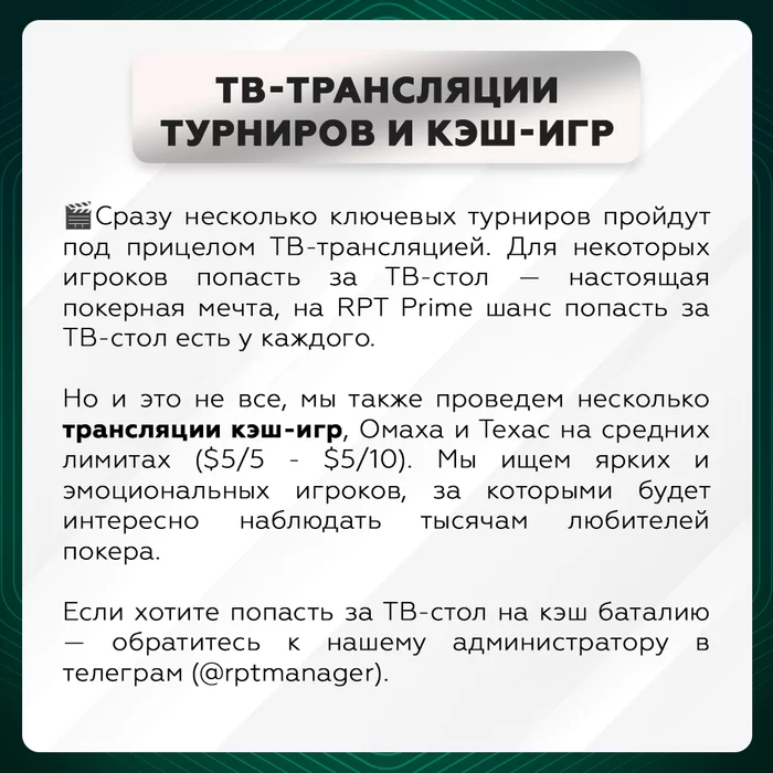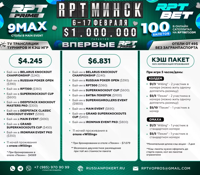 В рамках серии RPT Prime 6-17 февраля в Минске у нас намечается биток игроков, соответственно и кэша будет очень много! ⠀ 💰 Абсолютно любой кэшевик (даже на лимите 1/3) может получить бесплатное проживание в отеле. Жить в уютном отеле абсолютно бесплатно — это не шутка, а реальность. Для этого необходимо минимально участвовать в кэш-игре 3 дня, играя по 5 часов/день, и бесплатный отель у вас в кармане. ⠀ ♠️ Чтобы воспользоваться предложением, нужно до старта серии забронировать КЭШ-ПАКЕТ (их кол-во ограничено!). Сделать это можно как на сайте russianpokert.ru, так и через менеджера в Telegram — https://t.me/russianpt. ⠀ 🎬 Любителям ТВ-трансляций: традиционно мы проведем сразу несколько ТВ-трансляции наших кэш-игр — Омаха и Техас (5/5 - 5/10). Мы ищем ярких и эмоциональных игроков, за которыми будет интересно наблюдать тысячам любителей покера. ⠀ Если хотите попасть за ТВ-стол на кэш баталию — обращайтесь к нашему администратору в Telegram — https://t.me/rptmanager.