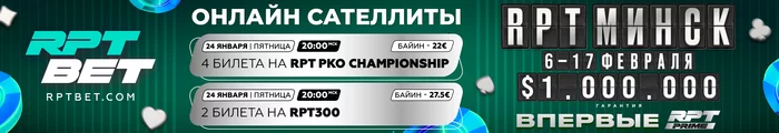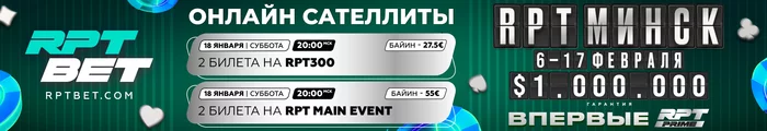 🏆🏆 Сегодня в онлайн-сателлитах на RPTBET — два крутых отборочных турнира к RPT Prime 6-17 февраля в Минске: разыграем минимум ЧЕТЫРЕ БИЛЕТА в Belarus PKO Championship, а также минимум ДВА БИЛЕТА в RPT300.