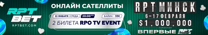 🏆 Очередной онлайн-сателлита к RPT Prime 6-17 февраля пройдет сегодня на RPTBET — разыграем минимум ДВА БИЛЕТА в турнир RPO TV Event Day 1A.