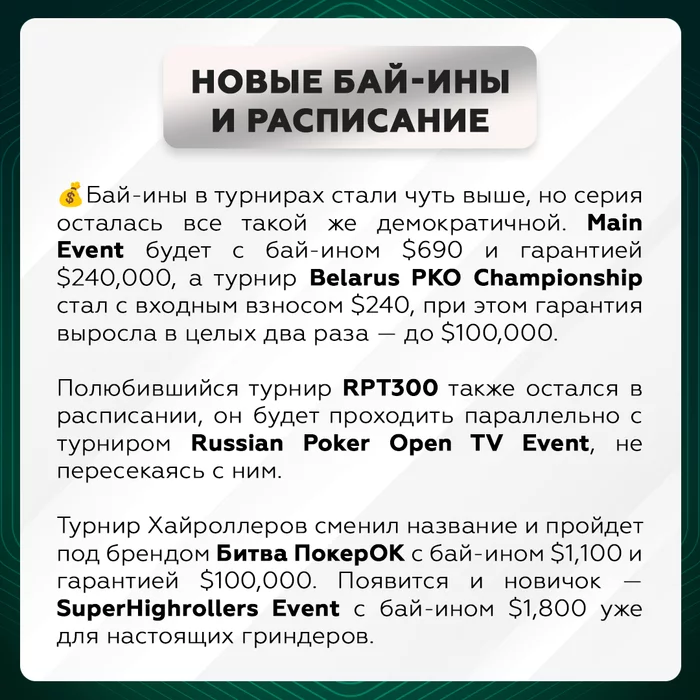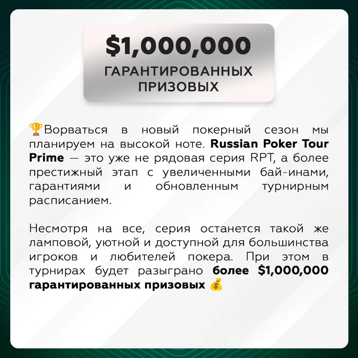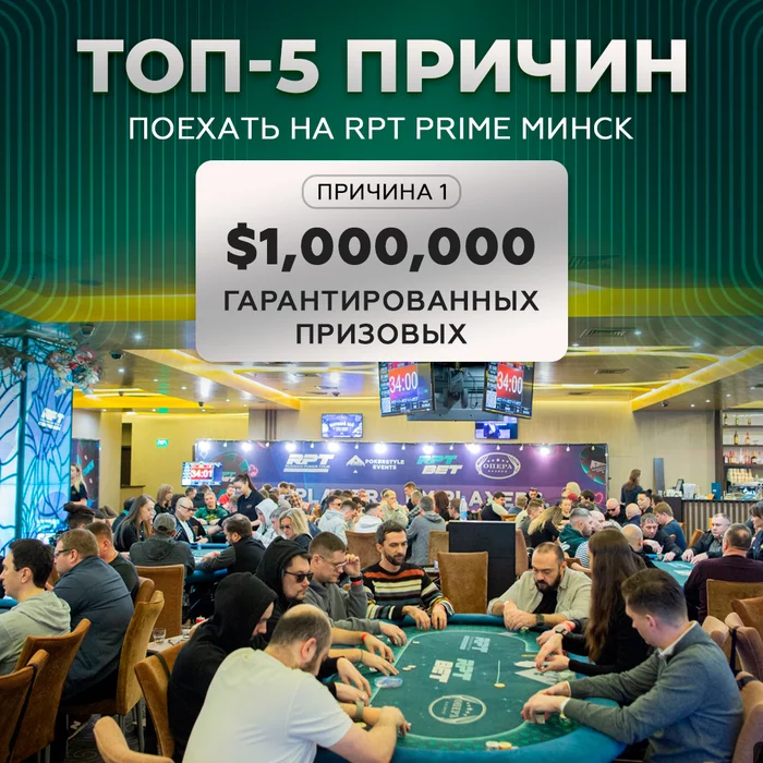 🏆 Всего две недели до старта рекордной серии RPT Prime в Минске, которая будет проходить с 6 по 17 февраля в казино Опера! ⠀ 💰 Миллионная гарантия, новое крутое расписание с обновленными турнирами, бай-инами и выросшими гарантиями... В одном посте всего и не расскажешь, но мы все же попытались 😎 ⠀ Вашему вниманию (смотри картинки ниже 👇) — топ-5 причин, почему на RPT Prime в Минск уже через пару недель съедется огромное множество игроков!