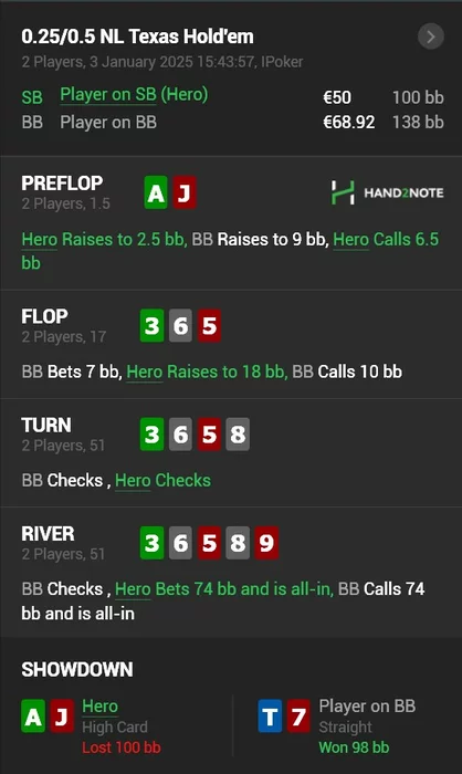 Margot, Я не говорю, что оппонент что то неправильное сделал. Речь о о том, что я закладывал ему рейндж содержащий натсы/мусор, а он показал руку которую я ему вообще не клал. А значит колл с блафкетчем огромная ошибка. И это прям расстраивает в моменте. Раздачу не могу найти, вроде отмечал ее...
