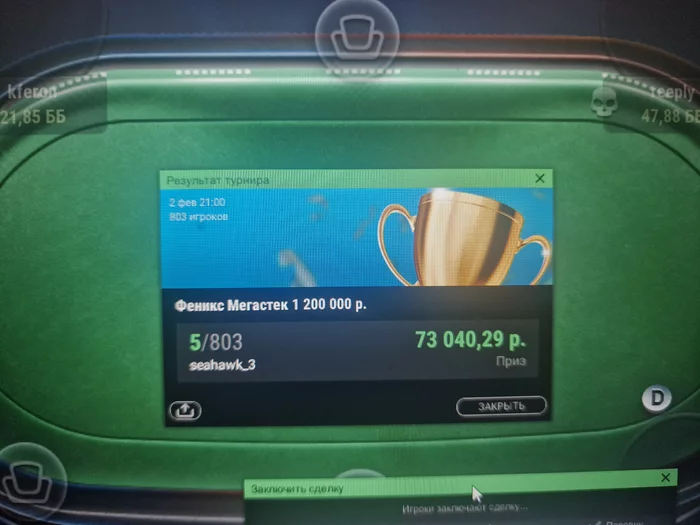 Сегодня отмазка хорошая произошла на ПД, сессию вывел в плюс 50к, не сложилось в конце, но держался, как лев в топ-15, самым коротким полз, так и на финалку закатился 8мах и смог 2из пересидеть. Но ключевая не сложилась. Чипак с БТН пуш КТо я на сб 10бб кол с А7о, и ББ долго сидел думал и нажал кол 13бб с JJ, доска: 78Кхх, КТо двоих снял с пробега и хитрожопые в 3мах поделили.