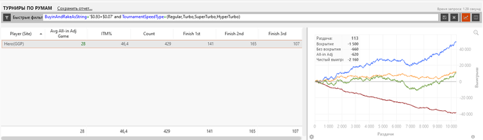 Присутствует ощущение, что излишне много пушу, так как часто попадаю под доминацию, но с другой стороны и скидывают ребятки очень хорошо, поэтому пока наблюдаю и наигрываю дистанцию. Еще кажется, что попадаю под доминацию чаще чем должен, так как часто в выставлениях вижу АJ против QQ, KJ vs KQ и т.п., хотя скорее всего это фокус на негативе. В любом случае, планирую набить хотя бы 3к турниров чтобы делать выводы и искать человека, который за недорого посмотрит базу и укажет на явные ошибки.