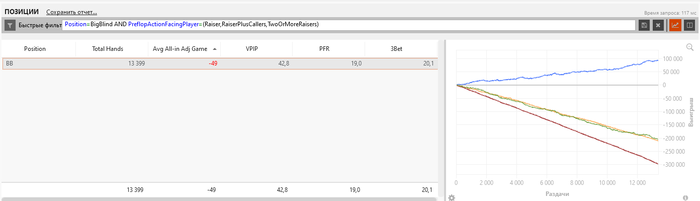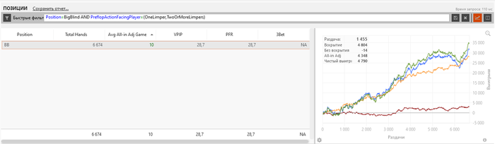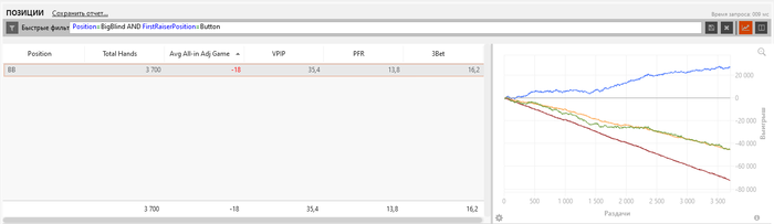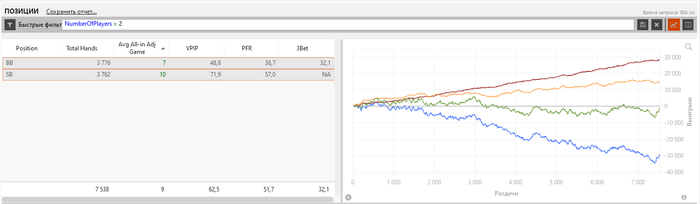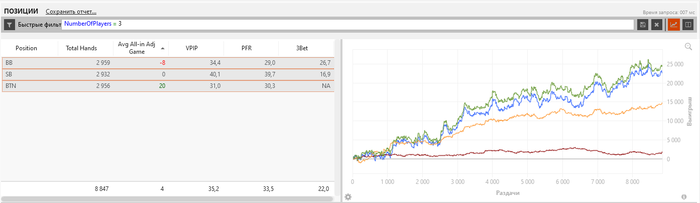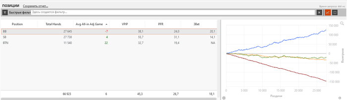 Если смотреть по позициям, то BTN пока трогать не буду, в плюс - уже хорошо. SB в слабый плюс - тоже пока потерпит, разве что немного расширю диапазон пуша в ха при пуш/фолде. Надеюсь это поможет выиграть немного фишек по красной, не в ущерб синей (myfinfactory, спасибо за информацию 🤝).