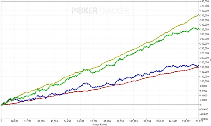 Судя по графику ты играешь HU в ноль, а с учетом рейка в жесткий минус! И это не много проблем!? Основные деньги зарабатывают именно в HU. Про 3макс вообще молчу. Про красную уже писал. На таких лимитах график должен выглядеть примерно так: