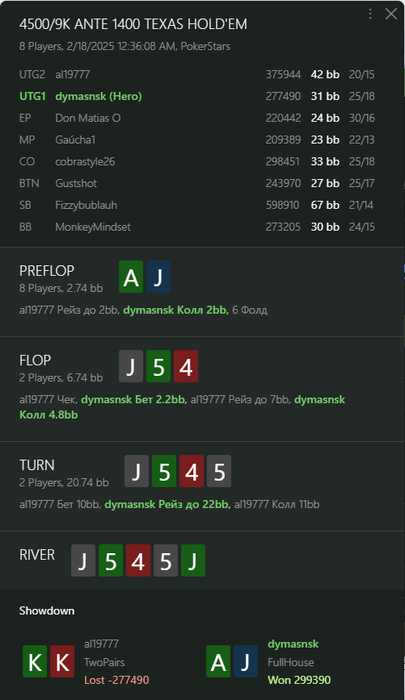 Да уж веселая получилась финалка, вышел чиплидером, спустился до 10 бб, раскрутился опять до чиплидера, в итоге вышли в ХА с парнем из Беларуси, с перевесом 3 к 1 в его пользу и попасть в борд я вообще не мог, а там где попадал, у него доезжали бекдорные флеши, но я в целом доволен как отыграл, одна раздача правда плохо сыграна было, но повезло конечно с ривером: