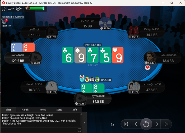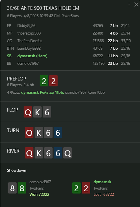 Тут пока не складывается совсем были какие-то небольшие итм, но в самых важных раздачах проигрывал аллыны, и самое забавное, что когда остается 1-2 блайнда, то идешь аллин с К8, тебя 2 колят с КК и ТТ, и зачем-то флоп падает 88 и ты выигрываешь, да лучше бы я прошлый аллин затащил 😂 В общем ГСЧ Покерка меня особо не любит, надеюсь, что пока 😆