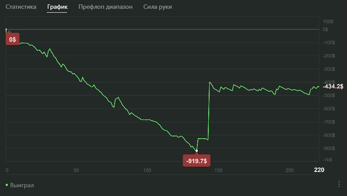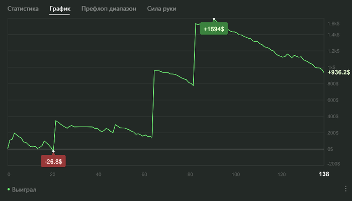 Отыграл в плюс 936$, в целом неплохо, но концовка вообще не складывалась, были только мелкие финалки и в те еле еле заползал с коротким стеком и тут же вылетал одним из первых.