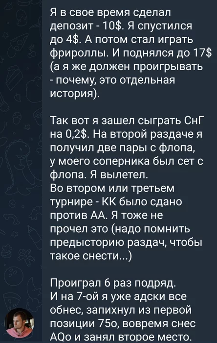 Меня знают многие ребята на низких лимитах, они сотнями турниров видели, как я практически безошибочно делал фолды мощных рук, вплоть до QQ со стеком в 5ББ в 6макс игре.