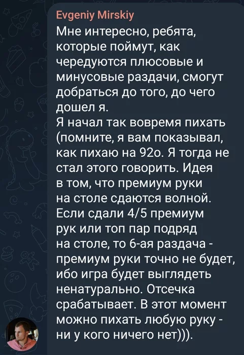 Завидуй-мне @ 26.02.25Мозг очень любит выявление закономерностей. Даже если никаких закономерностей нет) Очень легко попасться в эту ловушку тем более в игре, где от твоих решений можно проигрывать или выигрывать деньги. Ну каждый развлекает себя как хочет.