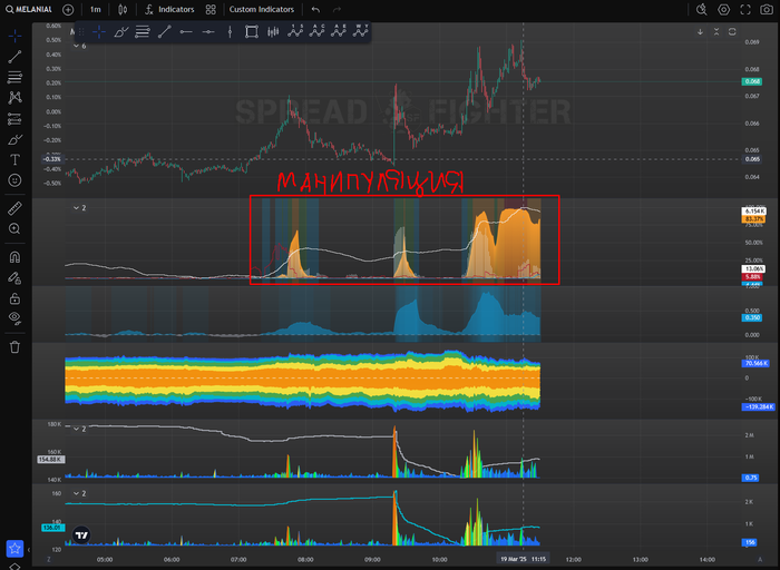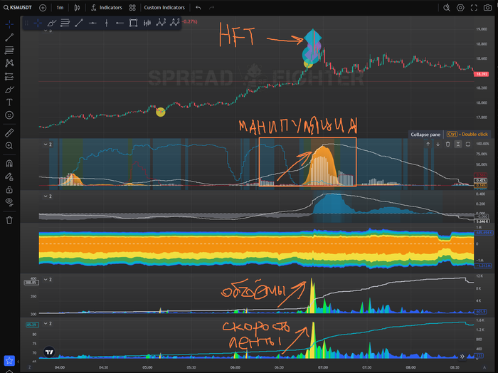 Наткнулся на Spreadfighter — интересный софт для трейдеров. Его разработали кванты и профи из СНГ, и он помогает анализировать рынок глубже: волатильность, стаканы, объемы, сделки, ликвидность — всё в одном месте. Данные проходят через нейросеть, и на выходе получается удобный индикатор.
