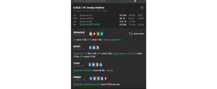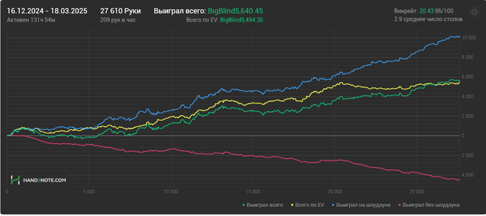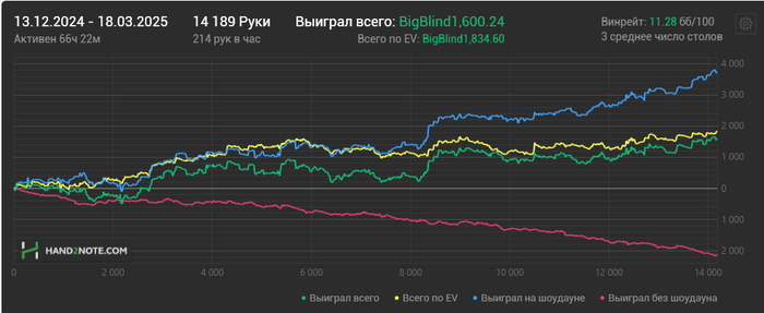 Из хороших новостей: начал заниматься с тренером (https://www.gipsyteam.ru/profile/leo777). Хочу порекомендовать его тем, кто хочет серьёзно повысить свой уровень игры. Он действительно разбирается в дисциплине, причём не только в логике солвера, но и знает, как адаптировать это к реальной игре, что очень ценно. Он точно понимает, о чём говорит, и если возникают вопросы — даёт чёткие ответы. Провели уже две тренировки, причём первую тренер провёл бесплатно (разбор видео). В общем, настроен продолжать работать с ним. Цена, можно сказать, символическая по сравнению с теми знаниями, которые он даёт, так что от души рекомендую.