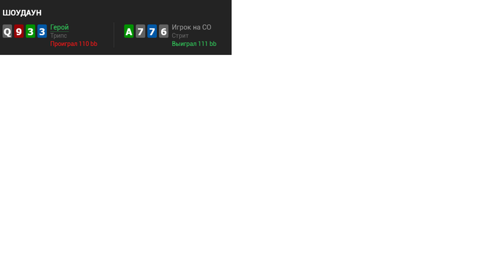 Привет! Подскажите как играем терн?Выставляемся на рейз или же просто колим. Посчитал, что с не натсовым стритом +натс ФД+2е ФД поехало, мне хватает эквити для пуша при низком СПР.