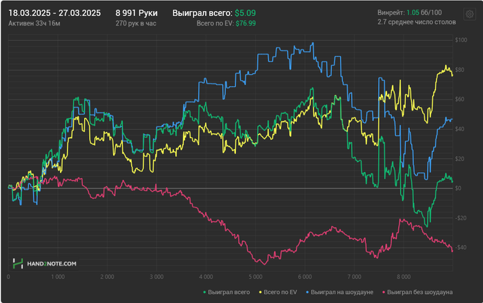 Вообще, начинал я писать этот пост во вторник, но уж очень сложно мне было закончить недельный отчет вовремя, "неделька" выдалась сложной на психологическом уровне. Было все: и тильт, и невезение, и плохая игра. В какой то момент я прям почувствовал что с каждым днем моя игра становится все хуже и хуже: я все чаще и чаще начинал грызться с фишами за банки, стал их же перекалывать в неблефовых спотах и тому подобное. Естественно свой план 5 часов за столами в день я не выполнил от слова совсем, зато план по теории я полностью отработал (а что еще делать весь день когда за столы просто страшно садиться).