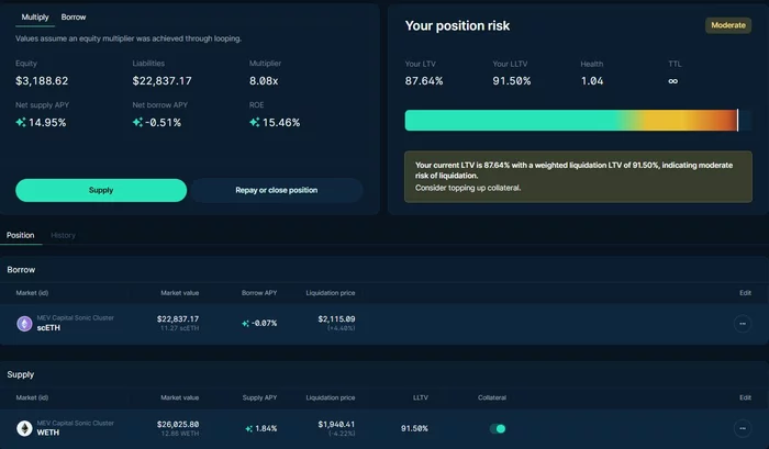 Теперь к главному: я открыл позицию в Euler через стратегию MEV Capital Sonic Cluster с парой WETH/scETH и мультипликатором x8. Вот ключевые показатели: