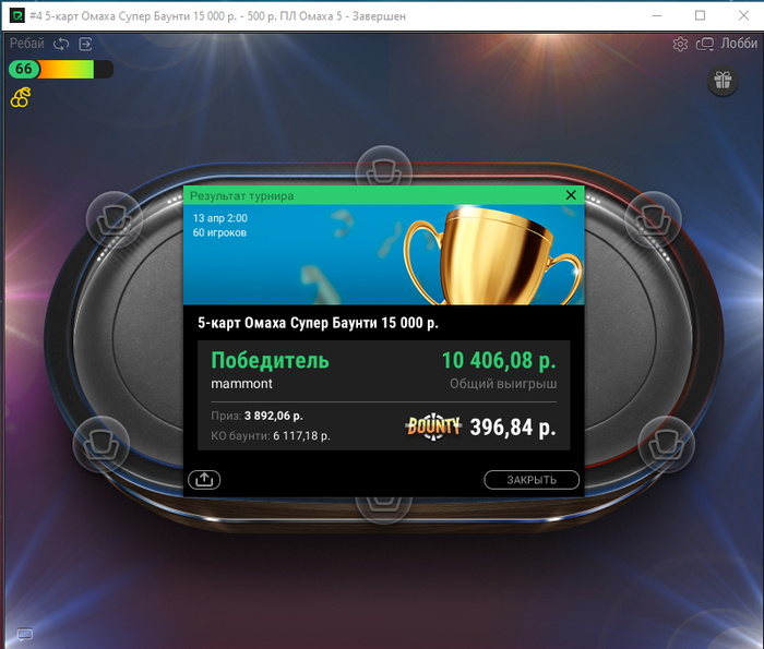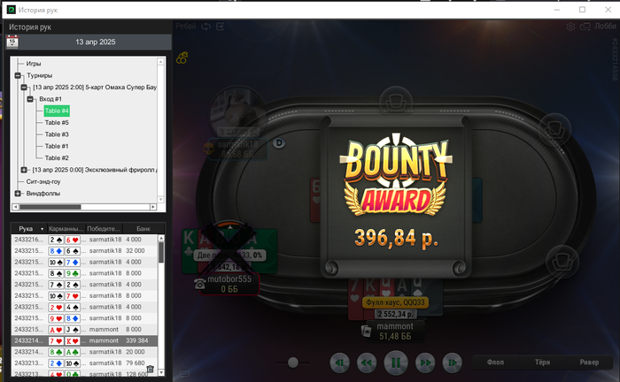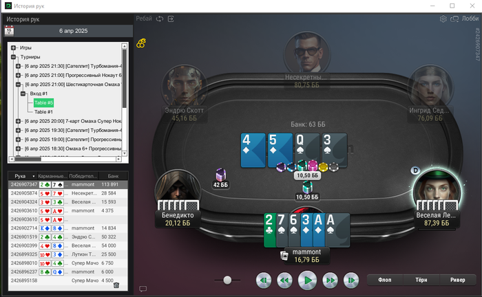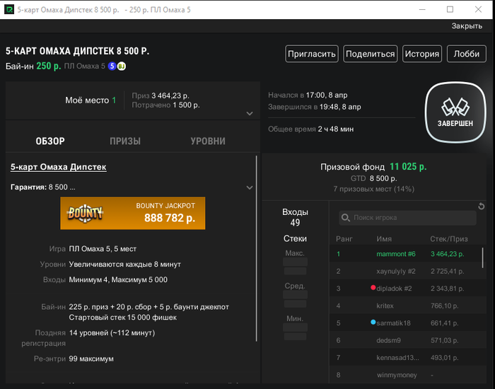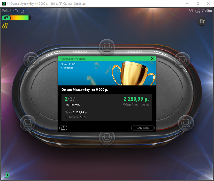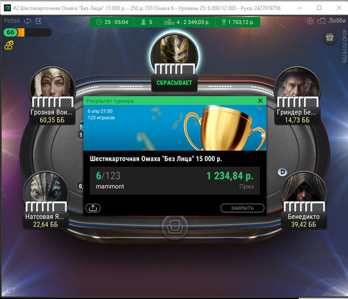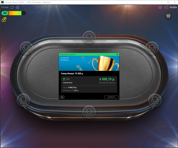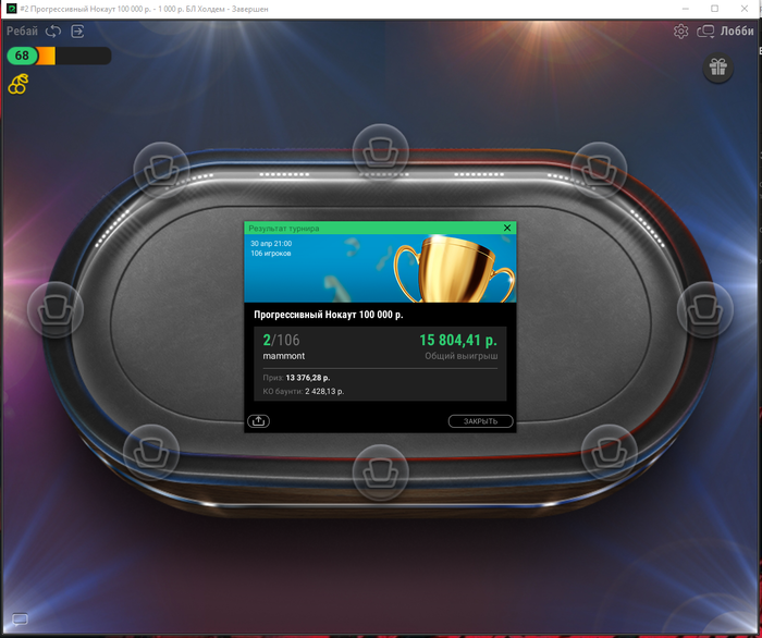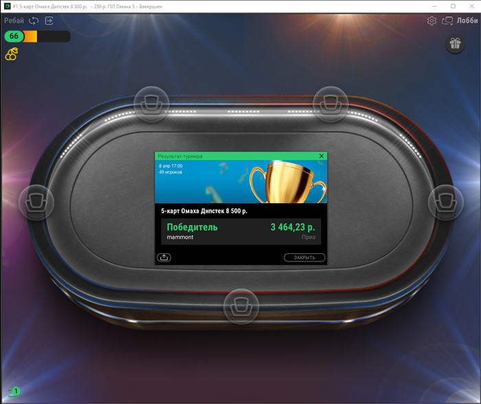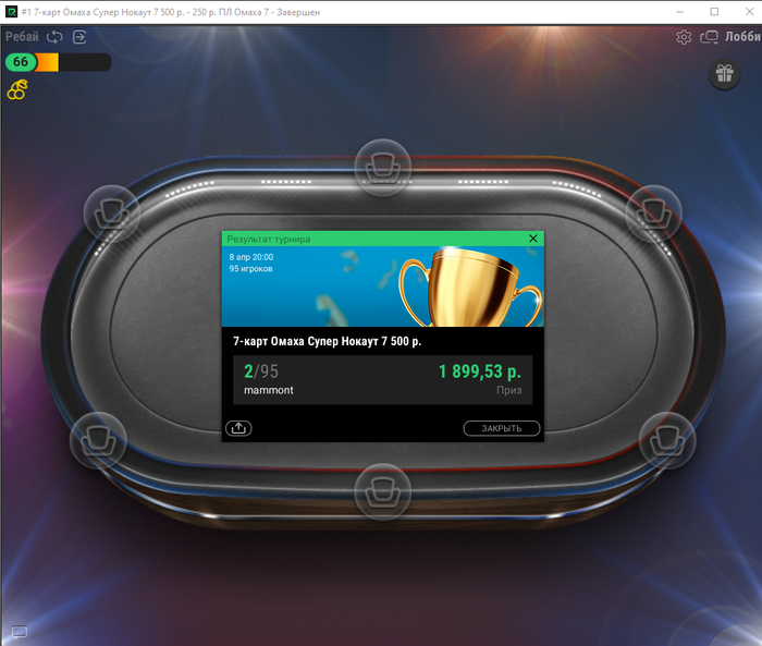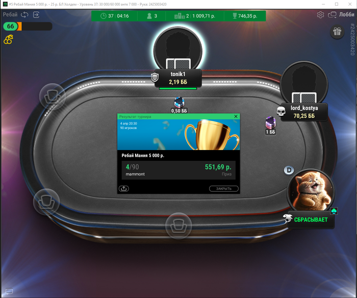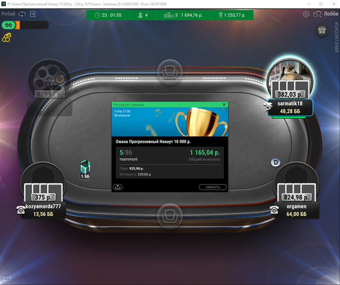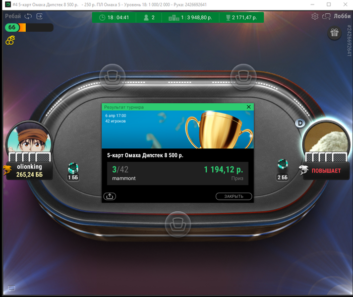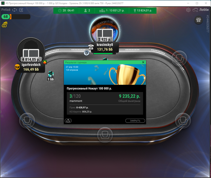 И сегодня вишенка на торте 150 бб против 18 бб, против маньяка для меня не реально было, поэтому 2 место! В 3 макс была долгая борьба около 250 рук, то меня измотало!