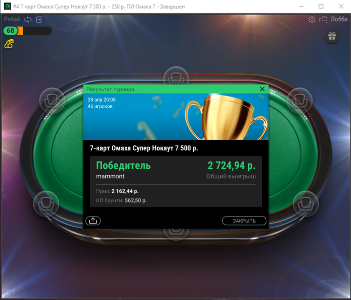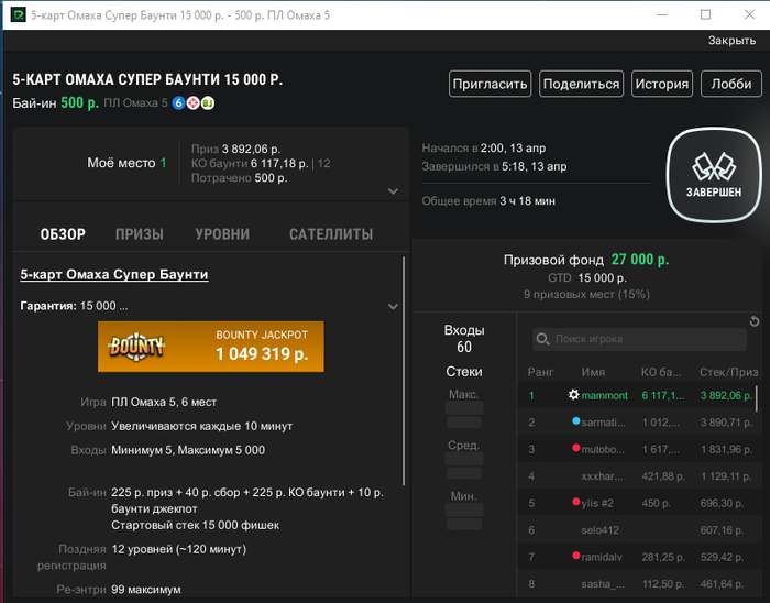 В общем все прискорбно. Я начинаю понимать, что в покере я никакой, думаю вот додепывать в великолепную 8 играть или пропади оно все пропадом. Какой прогресс я получил? Я перестал играть турниры за 2500 и 3500 и за 5000, реже стал заходить в 1000. Основной пул это 250-500, играю неаккуратно, несколько раз вылетел на бабле в 500. Во всех 1000 вылетел с топ диапазоном, выставлялся выше, грубых ошибок на этом лимите не было. Зачем то полез в кеш там и оставил все деньги, нереально переезжают 95%, это вводит в тильт, как же меня бесит эта пара аутов на ривере. Близится 67 уровень там заберу 3000 точно. Виндфоллы неделю играл в сумме получился небольшой минус, игрой там доволен. В общем месяц был пробным. С 1 мая начну с банкролла на 250 р. Скорее всего до того времени играть не буду. Думаю 15000-25000 рублей будет достаточно.