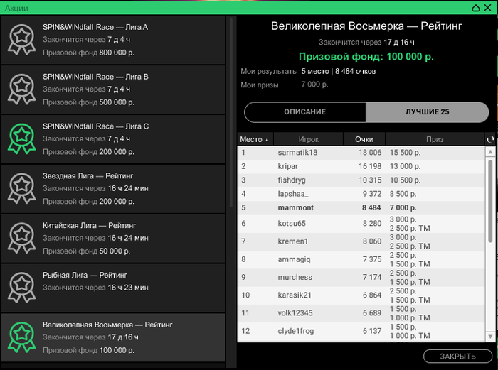 Депозит: 77800 рублей (63000 проиграно в казино). Ну что сказать - лудомания. Депозиты только для великолепной 8 буду делать, и собственно пока особо больше играть не буду. Один два турика по 25+R+A да и фрироллы.