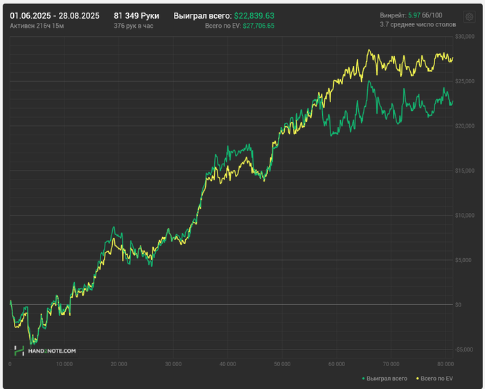 Отыграть получилось меньше задуманного - как говорится "лето - это маленькая жизнь", поэтому решил жопу не рвать, а просто жить, а играть по мере желания и возможностей. В августе подключил айпокер италию. Если коротко - мне не понравилось.)) Более подробно описал у себя в телеге. Ещё, в августе на чико получилось зацепить сайд джек на 200, и прибавить 6247$ к банкроллу! Это мой первый джек за более чем миллион раздач )