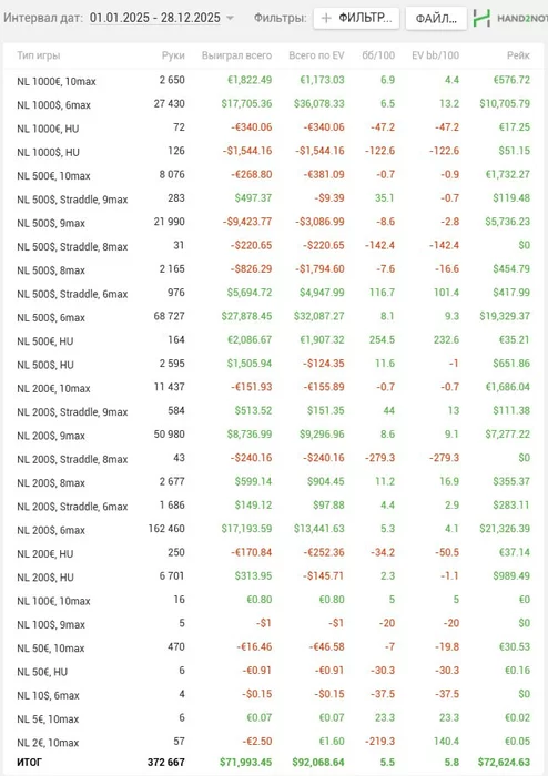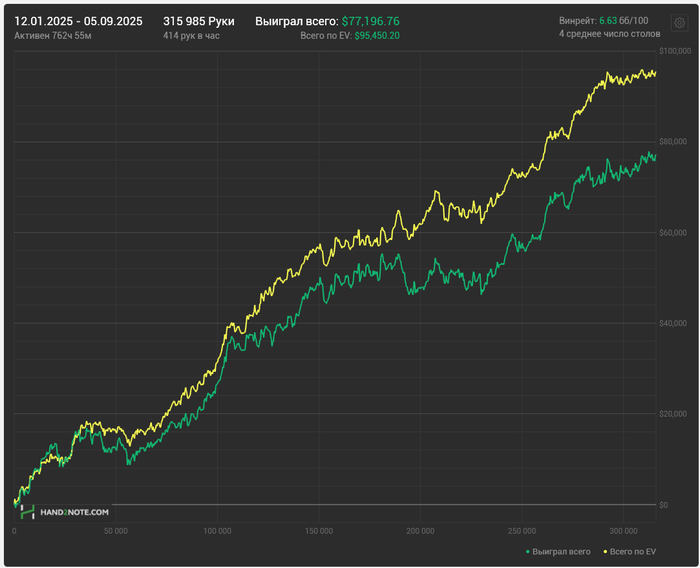 На данный момент откатал 316к рук с общим винрейтом около 7евбб/100, по факту 6.2бб/100. При этом словил весьма весомый недобор в алынах, но в бб все около дела - 10 стеков недодали.) Результатом этого отрезка более чем доволен, как по рукам, так и по $. К слову, в лучший год в режиме ленивой жопы получалось нафармить не более 65к$. ))