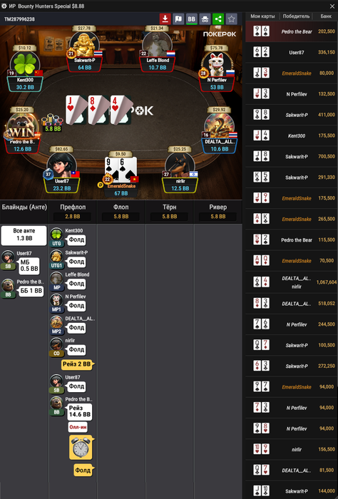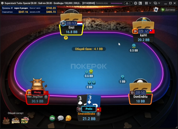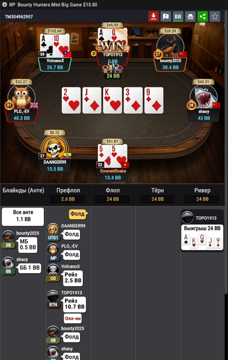 ну а если мы зарейзили 10бб, ББ пихнул оллин и Батон закрыл его, то мы заходим третьими только с JJ+