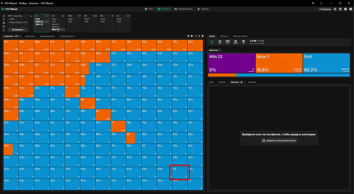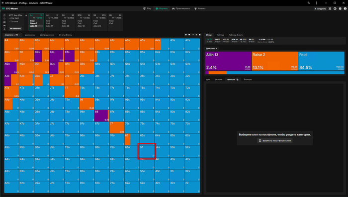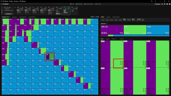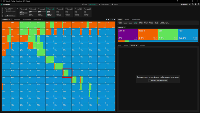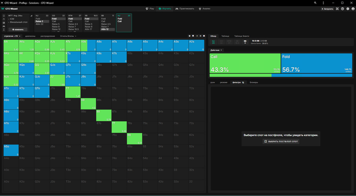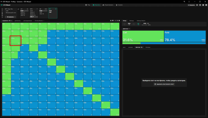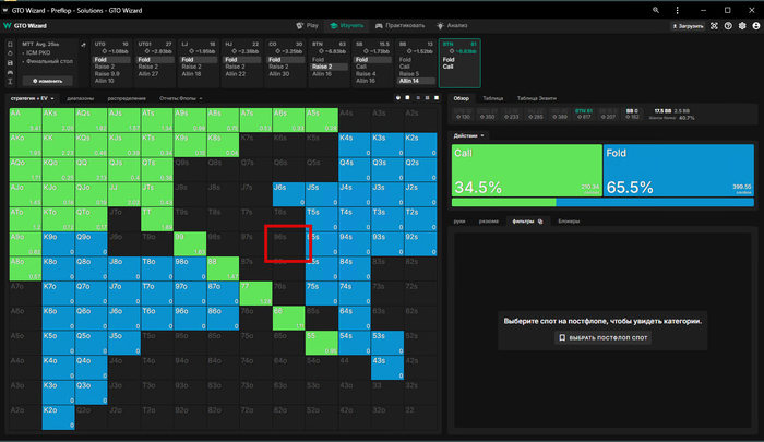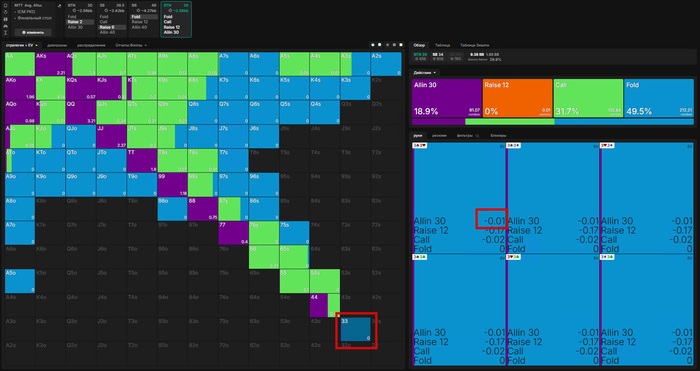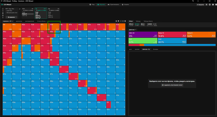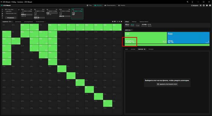 ну а если мы зарейзили 5бб, ББ пихнул оллин и Батон закрыл его, то мы заходим третьими только с QQ+, обратите внимание что даже AKs уходят в пасс🤔