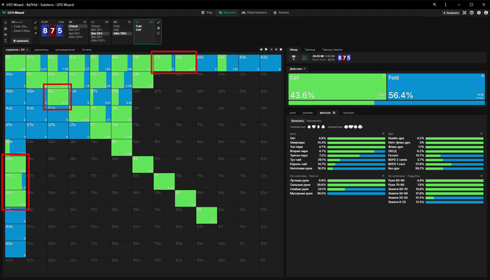 Вот диапазон закрытия после рэйза 5 бб, если в нас пухнул опенрейзер с Батона, довольно таки широкий