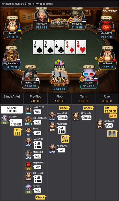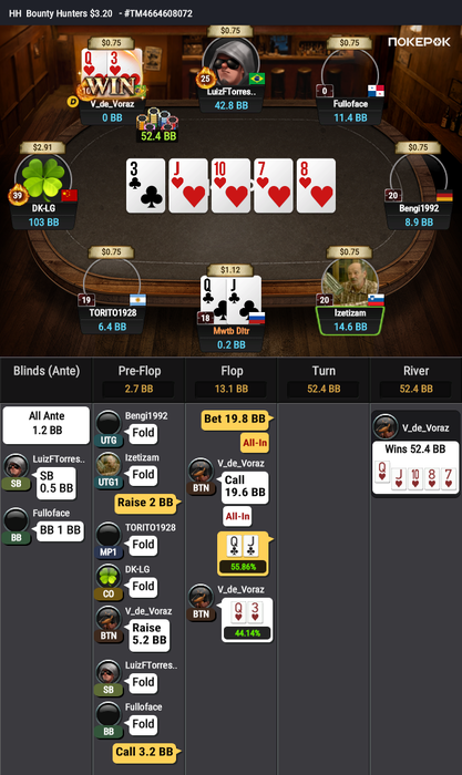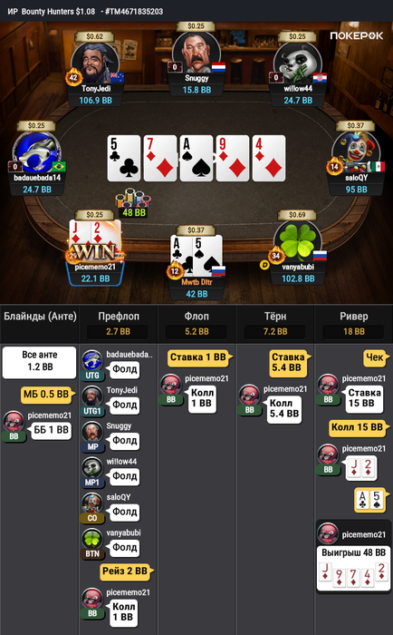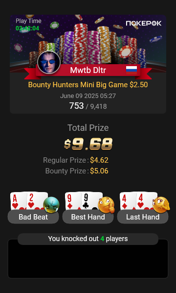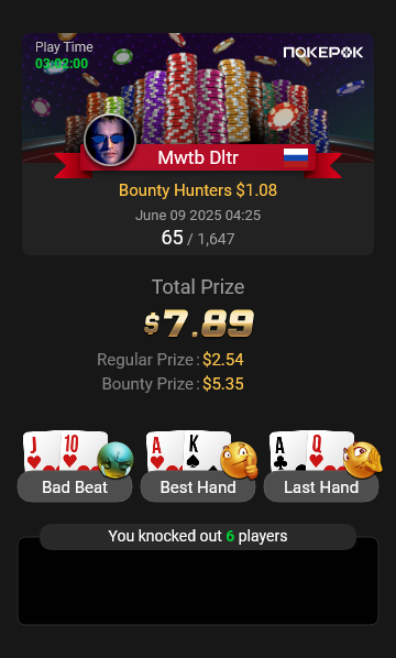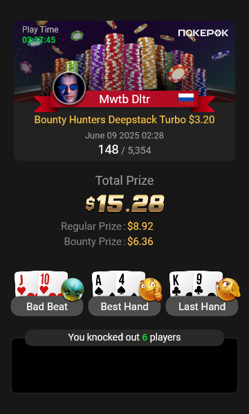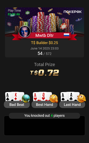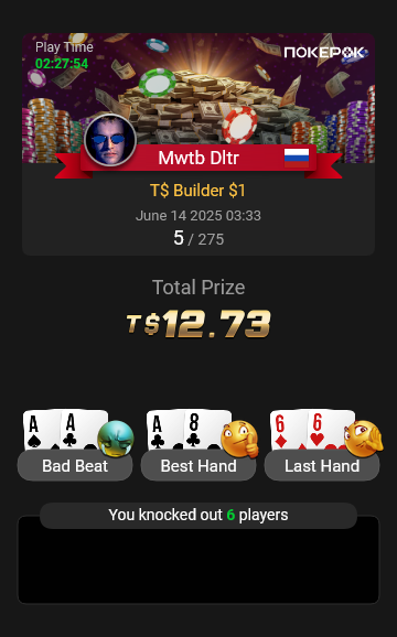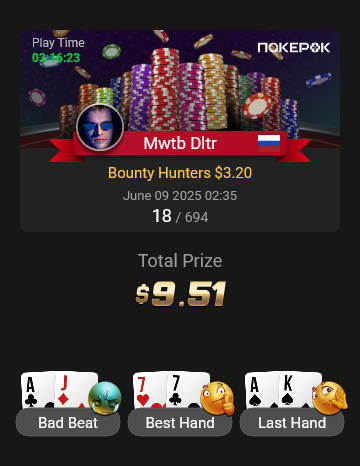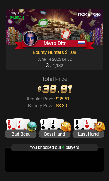 На финальный стол Bounty Hunters $1.08 долго не могли разыграть последний билет, сидели в топ-10. Три коротких (в том числе я), у соперника сдали нервы, и он пушнул JTo с утг, я колл AQо и сделал его бабблбоем финалки.