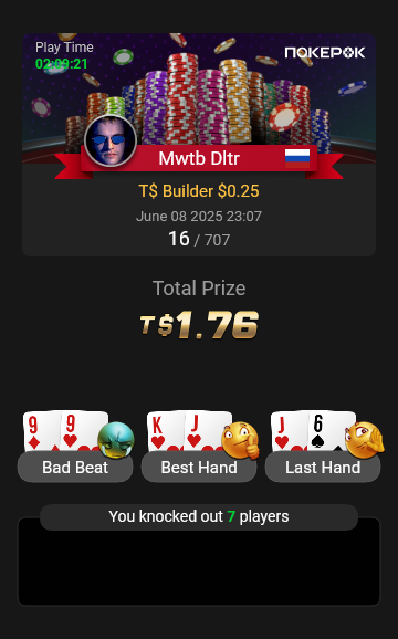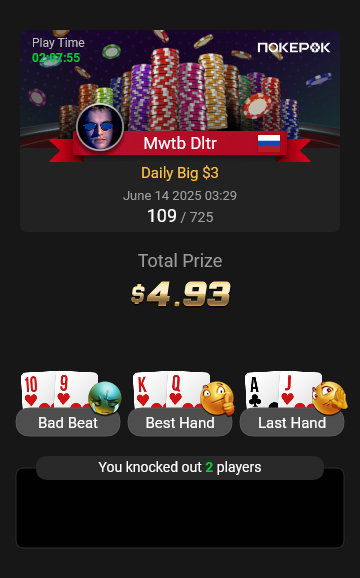 В субботу выспался, сел за игру, на этот раз вечером. И снова этот суходроч около нуля. Сначала ПокерОК поднимает тебя, дает пройти в ITM, а затем подсовывает руку, которую ты не можешь сбросить, и (О, чудо!) первый натс оказывается у хуесоса vpip 67, который зашел в раздачу с очередной хуетой. И, конечно же, потом благополучно раздаст мои фишки окружающим.