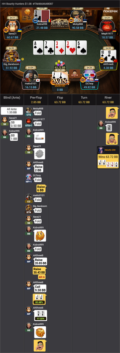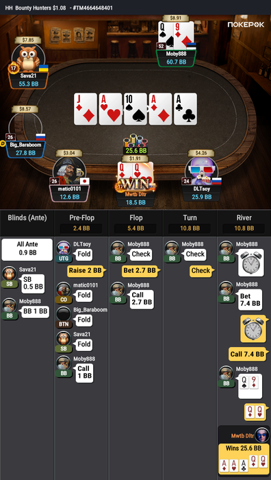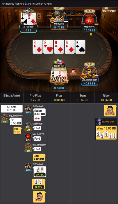 Затем чипак Moby888 несколько раз неудачно проблефовал в мои сильные руки, и я даже на некоторое время стал лидером.