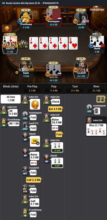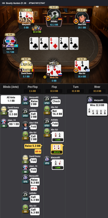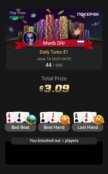 И опять на те же грабли. Вылет с KK в 4-way в глубоком ИТМ. Понятно, что в мультивее кармашки теряют эквити и часто проигрывают, но не с таким же завидным постоянством. Еще и целый сет словил, но не помогло. Такое возможно только в плохом кино и на GG: