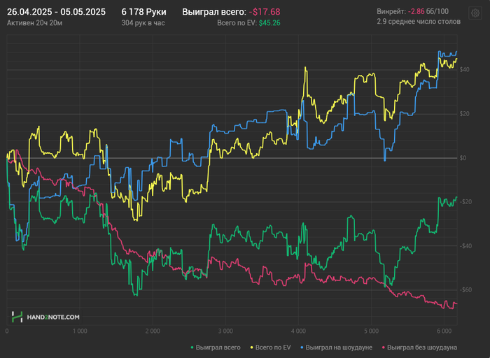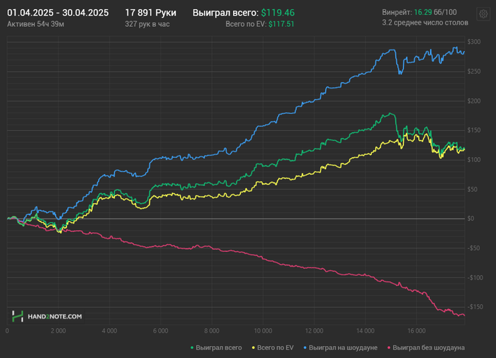Даже не смотря на плохой отрезок после перехода на НЛ10, все равно отыграл в 16 EV bb/100. Доволен этим результатом, но явно мог сыграть на много лучше, видел очень много банальных ошибок, которые буду исправлять.