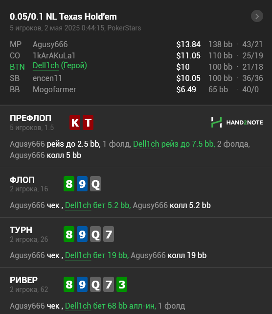 2) Если играть по дефолту, не имея такой широкой выборки на оппа, то вполне можно пушнуть ривер. Рука не блочит бэкдоры, но при этом блочит комбы с топ-парами.